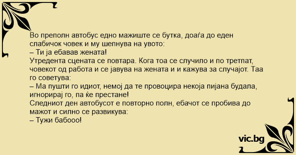 Во преполн автобус едно мажиште се бутка, доаѓа до еден слабичок човек и му шепнува на увото: