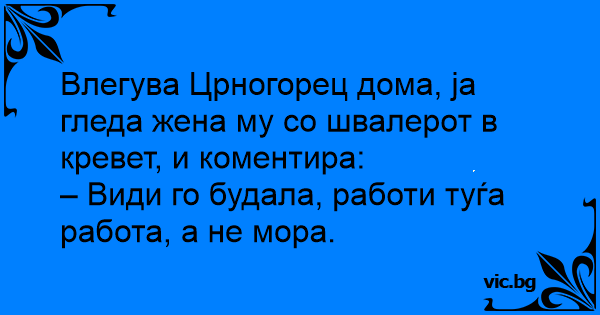 Влегува Црногорец дома, ја гледа жена му со швалерот в кревет, и коментира: