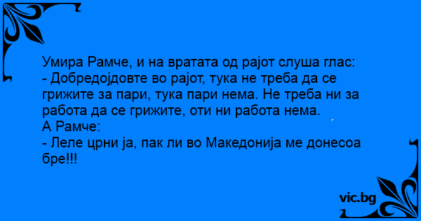 - Добредојдовте во рајот, тука не треба да се грижите за пари, тука пари нема. Не треба ни за работа да се грижите, оти ни работа нема.