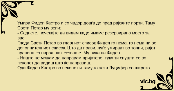 Гледа Свети Петар во главниот список Фидел го нема, го нема ни во дополнителниот список. Што да прави, луѓе умираат во толпи, рајот преполн со народ, пик сезона е. Му вика на Фидел: