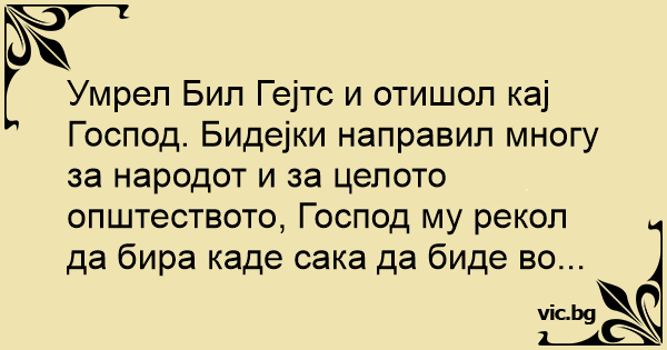 Умрел Бил Гејтс и отишол кај Господ. Бидејки направил многу за народот и за целото општеството, Господ му рекол да бира каде сака да биде во...