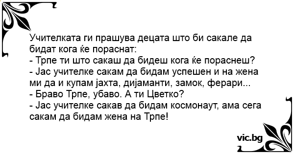 - Јас учителке сакав да бидам космонаут, ама сега сакам да бидам жена на Трпе!