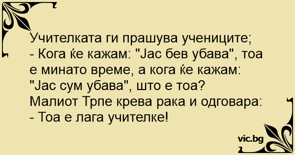 Учителька: — Послухай, Сергійку, якщо я скажу. "Я красива", — який це час? — Минулий, Валентино Василівно.