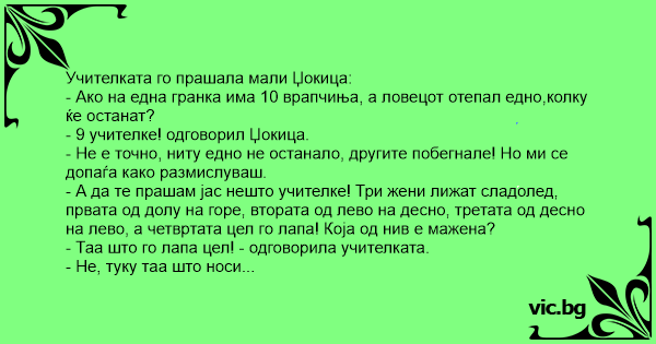 - А да те прашам јас нешто учителке! Три жени лижат сладолед, првата од долу на горе, втората од лево на десно, третата од десно на лево, а четвртата цел го лапа! Која од нив е мажена?