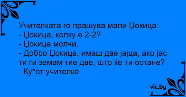 Училище: - Иване, колко е 2-2? - Не знам... - Имаш две яйца и аз ти ги взимам, какво ще ти остане? - Само уя...