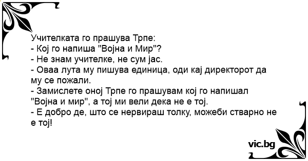 - Замислете оној Трпе го прашувам кој го напишал "Војна и мир", а тој ми вели дека не е тој.