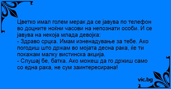 Цветко имал голем мерак да се јавува по телефон во доцните ноќни часови на непознати особи. И се јавува на некоја млада девојка: