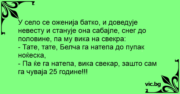 У село се оженија батко, и доведује невесту и станује она сабајле, снег до половине, па му вика на свекра: