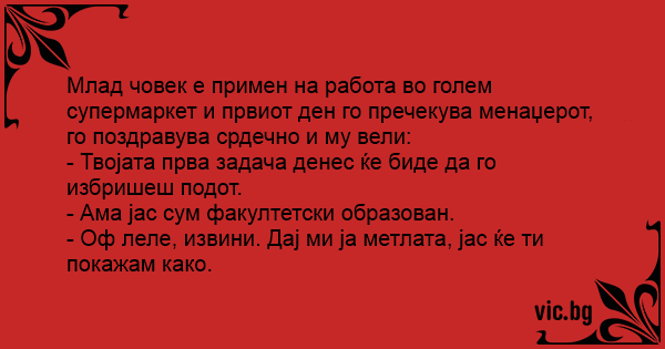 Шеф каже новому співробітнику: - Для початку підметіть в офісі підлогу! - Сер! Я закінчив Кембридж! - Обурюється той. - Ось воно що! Тоді дайте мені віник, та я покажу, як це робиться!