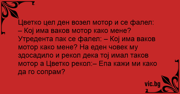 – Кој има ваков мотор како мене? Утредента пак се фалел: – Кој има ваков мотор како мене? На еден човек му здосадило и рекол дека тој имал таков мотор а Цветко рекол:– Eпа кажи ми како да го сопрам?