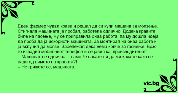 Стигнала машината ја пробал, работела одлично. Додека кравите биле на пасење, му се приправила онаа работа, па му дошла идеја да проба да ја искористи машината. Ја монтирал на онаа работа и ја вклучил да молзе. Забележал дека нема копче за гаснење. Брзо го извадил мобилниот телефон и се јавил кај производителот:
