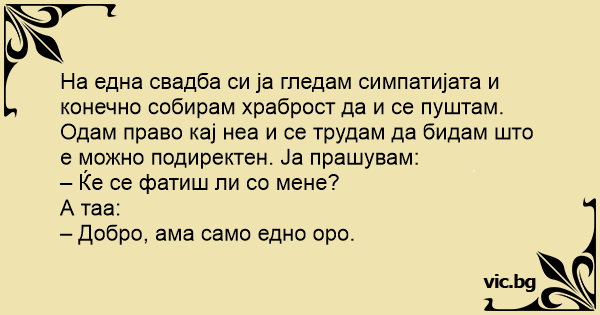 На една свадба си ја гледам симпатијата и конечно собирам храброст да и се пуштам. Одам право кај неа и се трудам да бидам што е можно подиректен. Ја прашувам: