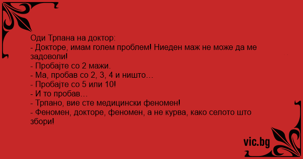 - Докторе, имам голем проблем! Ниедeн маж не може да ме задоволи!