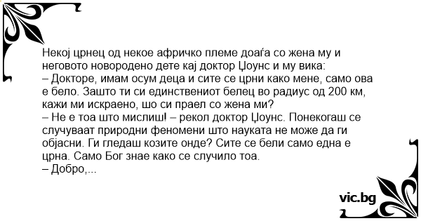 – Докторе, имам осум деца и сите се црни како мене, само ова е бело. Зашто ти си единствениот белец во радиус од 200 км, кажи ми искраено, шо си праел со жена ми?
