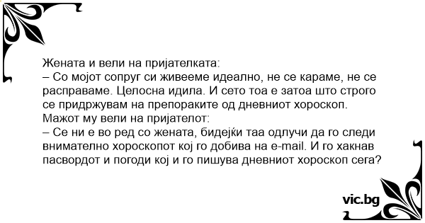 – Се ни е во ред со жената, бидејќи таа одлучи да го следи внимателно хороскопот кој го добива на e-mail. И го хакнав пасвордот и погоди кој и го пишува дневниот хороскоп сега?