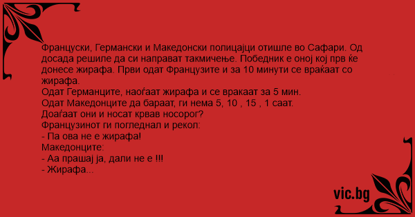 Француски, Германски и Македонски полицајци отишле во Сафари. Од досада решиле да си направат такмичење. Победник е оној кој прв ќе донесе жирафа. Први одат Французите и за 10 минути се враќаат со жирафа.