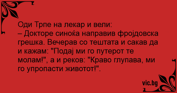 – Докторе синоќа направив фројдовска грешка. Вечерав со тештата и сакав да и кажам: "Подај ми го путерот те молам!", а и реков: "Краво глупава, ми го упропасти животот!".