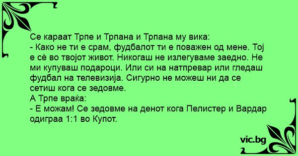 - Како не ти е срам, фудбалот ти е поважен од мене. Тој е сè во твојот живот. Никогаш не излегуваме заедно. Не ми купуваш подароци. Или си на натпревар или гледаш фудбал на телевизија. Сигурно не можеш ни да се сетиш кога се зедовме.