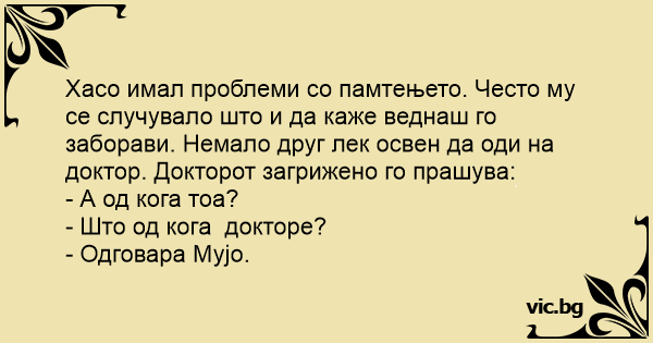 Хасо имал проблеми со памтењето. Често му се случувало што и да каже веднаш го заборави. Немало друг лек освен да оди на доктор. Докторот загрижено го прашува: