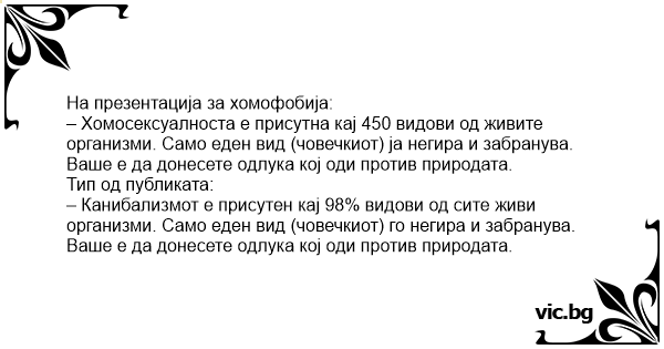 – Хомосексуалноста е присутна кај 450 видови од живите организми. Само еден вид (човечкиот) ја негира и забранува. Ваше е да донесете одлука кој оди против природата.