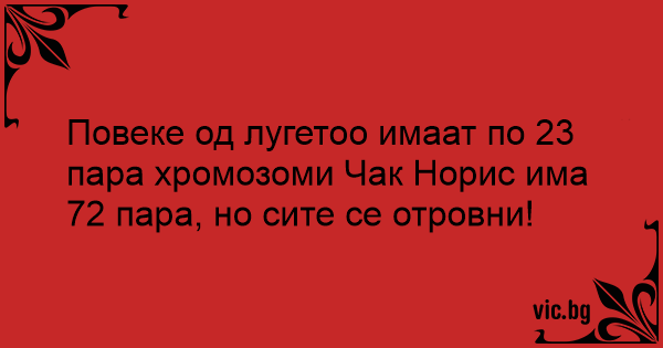 Повеке од лугетоо имаат по 23 пара хромозоми Чак Норис има 72 пара, но сите се отровни!