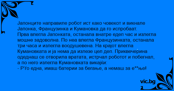 Прва влегла Јапонката, останала внатре едеп час и излегла мошне задоволна. По неа влегла Французинката, останала три часа и излегла воодушевена. На крајот влегла Кумановката и ја нема да излезе цел деп. Приквечерина одеднаш се отворила вратата, истрчал роботот и побегнал, а по него излегла Кумановката викајќи: