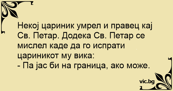 Починал некој цариник и оди кај Свети Петар и го прашуваат: - Сакате да одите во рајот или во пеколот? - Па, јас би сакал некаде измеѓу, ако може на граница.