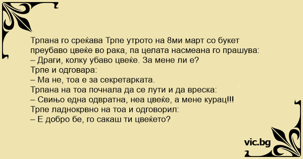Трпана го среќава Трпе утрото на 8ми март со букет преубаво цвеќе во рака, па целата насмеана го прашува: