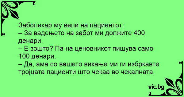 – Да, ама со вашето викање ми ги избркавте тројцата пациенти што чекаа во чекалната.