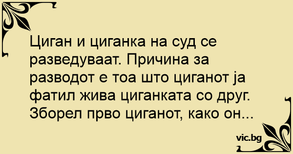 Циган и циганка на суд се разведуваат. Причина за разводот е тоа што циганот ја фатил жива циганката со друг. Зборел прво циганот, како он...