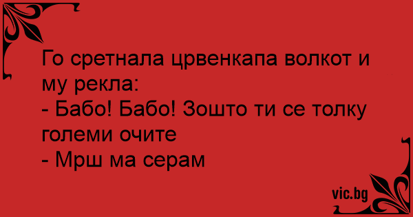 Idzie Czerwony Kapturek przez las, nagle zauważyła wilka: - Wilku, dlaczego masz takie wielki oczy? - Myk, myk Czerwony Kapturku - nie widzisz, że sram?