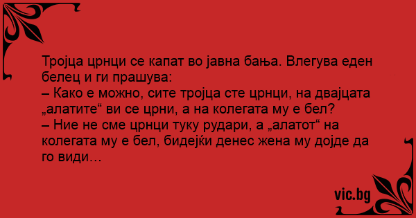 Тројца црнци се капат во јавна бања. Влегува еден белец и ги прашува: