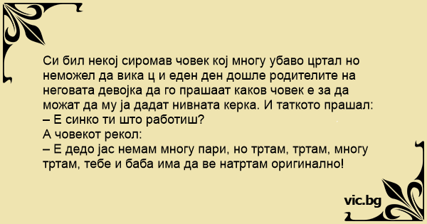 Си бил некој сиромав човек кој многу убаво цртал но неможел да вика ц и еден ден дошле родителите на неговата девојка да го прашаат каков човек е за да можат да му ја дадат нивната керка. И таткото прашал: