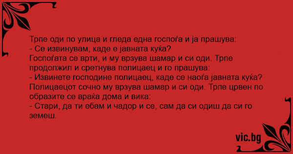 Госпоѓата се врти, и му врзува шамар и си оди. Трпе продолжил и сретнува полицаец и го прашува: