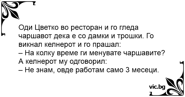 Оди Цветко во ресторан и го гледа чаршавот дека е со дамки и трошки. Го викнал келнерот и го прашал: