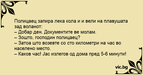 Полицаец запира лека кола и и вели на плавушата зад воланот: