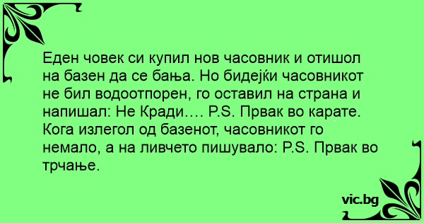 Еден човек си купил нов часовник и отишол на базен да се бања. Но бидејќи часовникот не бил водоотпорен, го оставил на страна и напишал: Не Кради…. P.S. Првак во карате.