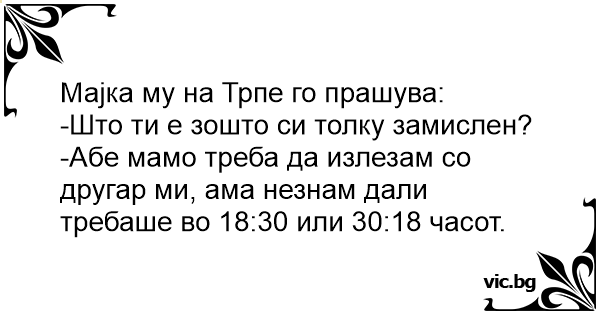 -Абе мамо треба да излезам со другар ми, ама незнам дали требаше во 18:30 или 30:18 часот.