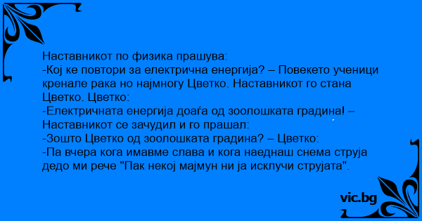 -Електричната енергија доаѓа од зоолошката градина! – Наставникот се зачудил и го прашал: