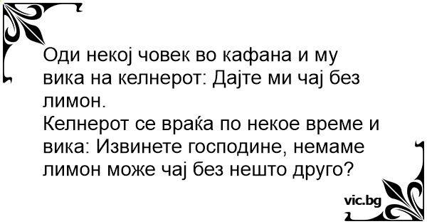 Оди некој човек во кафана и му вика на келнерот: Дајте ми чај без лимон.