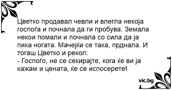 Цветко продавал чевли и влегла некоја госпоѓа и почнала да ги пробува. Земала некои помали и почнала со сила да ја пика ногата. Мачејќи се така, прднала. И тогаш Цветко и рекол: