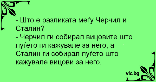 - Черчил ги собирал вицовите што луѓето ги кажувале за него, а Сталин ги собирал луѓето што кажувале вицови за него.