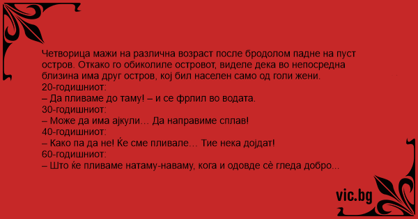 Нощ. Мъгла. Корабокрушение. Утро,слънцето изгрява и изненада. Мъжете се спасили на един остров,а жените на друг. От единия остров се вижда другият. Младите казват: Нощ. Мъгла. Корабокрушение. Утро, слънцето изгрява и изненада. Мъжете се спасили на един остров, а жените на друг. От единия остров се вижда другият. 20 годишният казва: - Сега ще преплувам до там... Na pustém ostrově ztroskotají muži ve věku dvacet, třicet, čtyřicet a padesát let. Po bližší prohlídce ostrova a okolí zjistí, že na ostrůvku hned vedle je skupinka ztroskotaných žen. Dvacetiletý... Затонув корабель. На один безлюдний острів врятувалися лише чоловіки , а на протилежний безлюдний острів - лише жінки. Після 3-х днів. 20-річний юнак : Давайте попливемо до жінок вплав. 30-річний :...