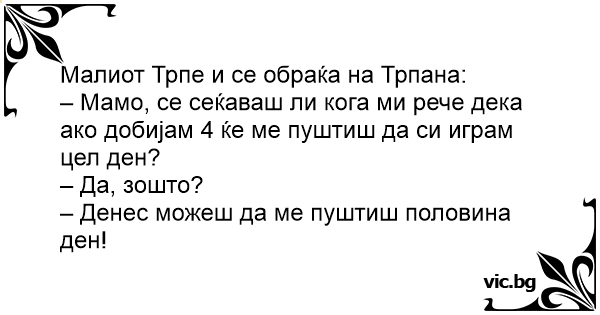 – Мамо, се сеќаваш ли кога ми рече дека ако добијам 4 ќе ме пуштиш да си играм цел ден?