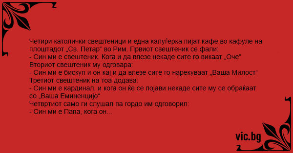 Четири католички свештеници и една калуѓерка пијат кафе во кафуле на плоштадот „Св. Петар“ во Рим. Првиот свештеник се фали: