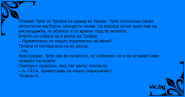 Отишол Трпе со Трпана на одмор во Тексас. Трпе отсекогаш сакал автентични каубојски шпицасти чизми, па веднаш купил еден пар на распродажба, ги облекол и се вратил горд во мотелот.