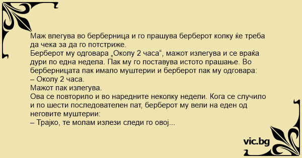 Маж влегува во берберница и го прашува берберот колку ќе треба да чека за да го потстриже.