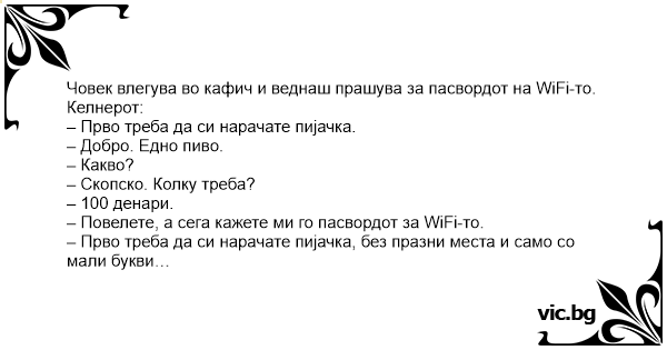 – Повелете, а сега кажете ми го пасвордот за WiFi-то.