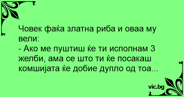 - Ако ме пуштиш ќе ти исполнам 3 желби, ама се што ти ќе посакаш комшијата ќе добие дупло од тоа...