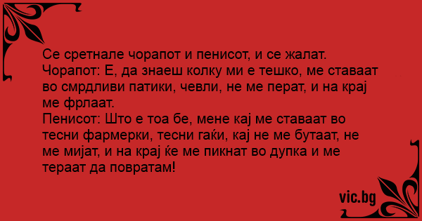 Пенисот: Што е тоа бе, мене кај ме ставаат во тесни фармерки, тесни гаќи, кај не ме бутаат, не ме мијат, и на крај ќе ме пикнат во дупка и ме тераат да повратам!